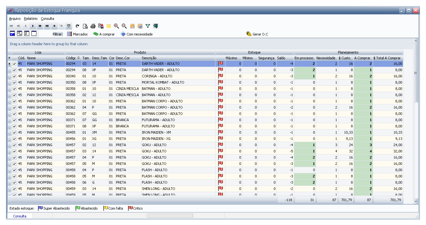 Revisada para entrar já marcados os itens que necessitam de reposição de acordo com o parametrizado. Com um clique podem ser geradas as ordens de compra.